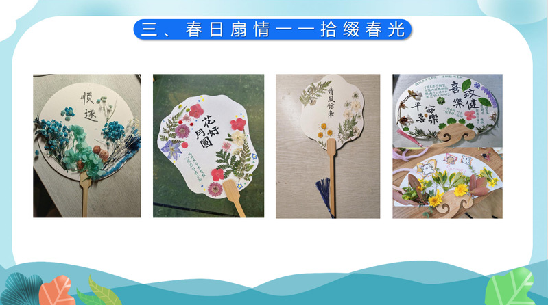 在校园中收集花瓣和树叶,在团扇上做出自己心中的春天。“做扇轻摇香杳杳,轻摇宝扇动香风”。学生融合自己的创意、发挥想象力,在素白的扇面上,利用各式各样的花朵和叶子勾勒心中春意,让原本平淡无奇的扇面变得缤纷多彩。