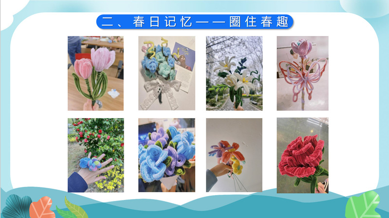 在李园的一角,学生用扭扭棒描绘出春天的色彩和生命力。一根根扭扭棒经过学生的创作之后变得妙趣横生、多彩多样。每一份作品都融入创作者的情感和想象,每一份作品都拥有不同的意义,虽是铁丝做成的扭扭棒,但每份作品都是不同的“春色”
