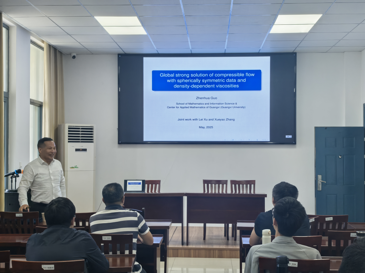郭真华教授聚焦于密度依赖粘性系数的可压缩流问题,针对球对称数据情形,阐述了等熵可压缩 Navier-Stokes 方程全局强解的存在性。通过构造特殊形式的解析解,结合 BD 熵估计、高阶可积性估计等方法,证明了在特定粘性系数形式和初始条件下,系统存在不出现真空态的全局强解,并给出了密度和速度的正则性及上下界估计,为理解高维可压缩流中真空态的形成问题提供了正面案例和理论依据。
