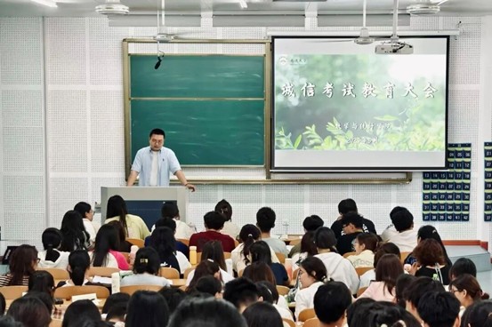 在诚信考试教育大会中,聚焦学术诚信与考风考纪建设。学院通过政策解读、案例警示、互动宣誓等环节,向全体在校生传递“守正笃实”的学术理念。会上强调考试作弊的严重后果,引导学生以真才实学应对挑战,以诚实守信树立人格。活动通过传统文化经典诵读、教育短片赏析等形式,将“诚信”精神融入校园文化血脉。全体学生集体诵读《诚信考试承诺书》,以铿锵誓言彰显坚守学术底线的决心