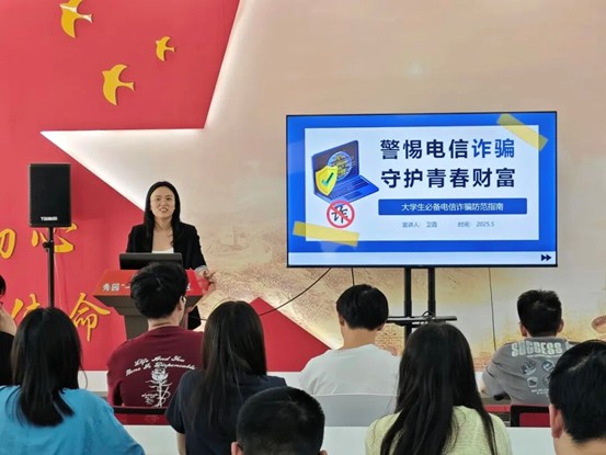 活动伊始,主持人简要介绍了活动背景及嘉宾阵容,强调在高校开展反诈法治教育的时代意义和现实必要。卫霞律师随后作专题讲座,系统阐述了电信诈骗的基本概念,指出其具有“隐蔽性强、手法多样、危害极大”的特点,并列举了大学生群体易受骗的多种原因。随后,她围绕当下高发的诈骗类型进行了详细剖析,包括冒充公检法、银行、电信运营商,虚假购物、网络刷单返利、虚假投资理财、虚假贷款、婚恋交友诈骗等十二种典型手段,通过生动案例还原真实场景,引发现场学生强烈共鸣。