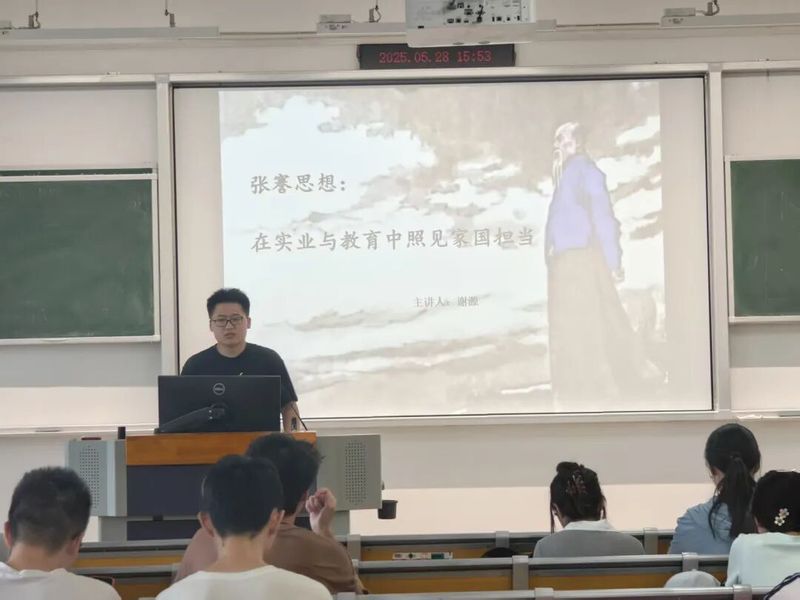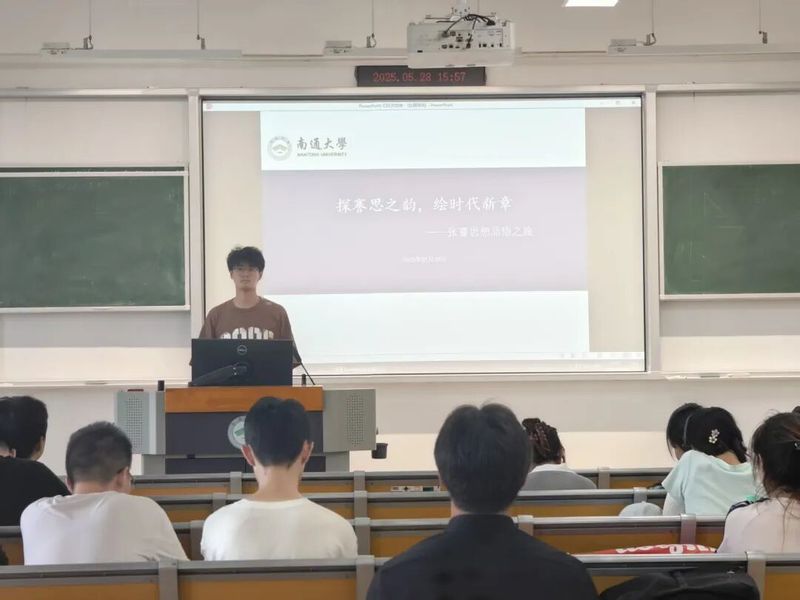 谢源同学围绕“张謇思想的现代叩问:在实业与教育中照见家国担当”这一主题展开分享。他详细阐述了张謇先生如何将个人志业与民族命运深度绑定,以“实业救国”与“教育兴国”为双桨,在近代中国的洪流中开辟出一条独特的改良之路。通过讲述张謇先生创办大生纱厂、构建“实业-教育-公益”闭环体系的壮举,以及他在南通地方建设中展现出的“村落主义”蓝图,让同学们深刻感受到了张謇思想的实践品格和时代价值。
