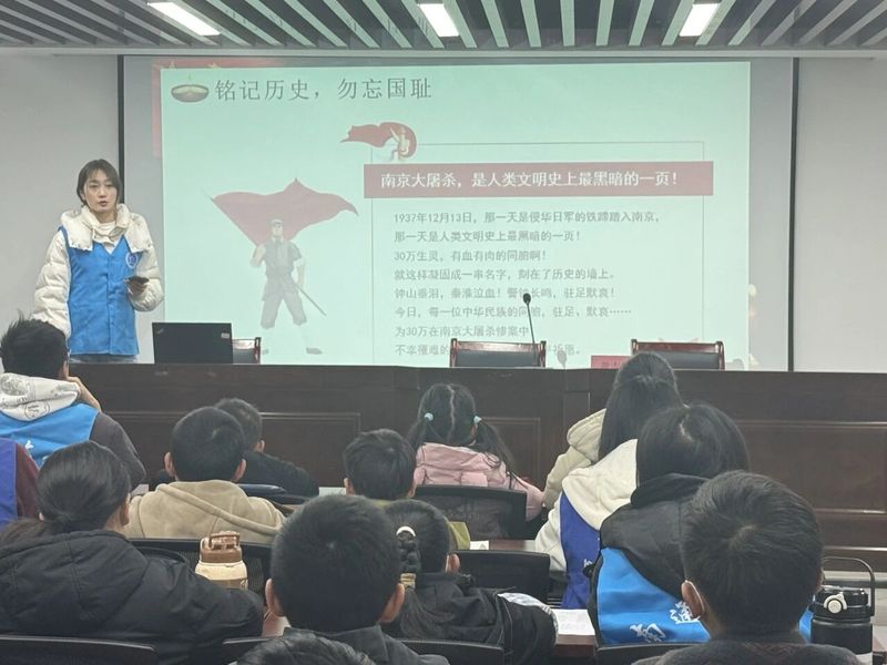 在“历史真相小课堂”环节,陈佳雪结合权威资料,用青少年易懂的语言梳理国家公祭日的设立历程:2014年2月27日,十二届全国人大常委会第七次会议表决通过,正式将12月13日确立为南京大屠杀死难者国家公祭日。同时,她还详细解读《南京市国家公祭保障条例》中“全城默哀一分钟”的规定,着重向孩子们阐明:设立国家公祭日并非延续仇恨,而是为唤醒全人类的历史记忆,杜绝忘却与麻木,以史为鉴守护来之不易的和平。