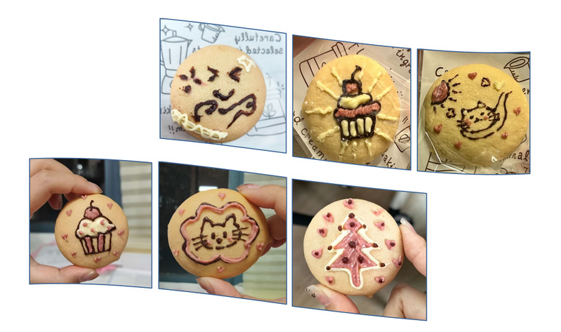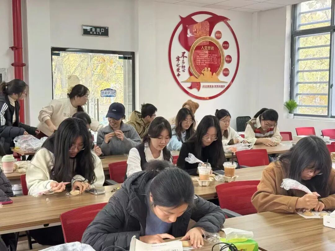 活动现场暖意融融,同学们围坐桌前,手中的圆软饼胚承载着放松的期许,融化的巧克力则成为情绪表达的“媒介”。细描线条时的凝神,填充肌理时的投入,让学业的忙碌与生活的烦忧暂时退场。星星的灵动、笑脸的明媚、爱心的炽热……每一笔勾勒都是情绪的自然流露,每一处图案都藏着对自我与他人的接纳。同学们在沉浸式创作中释放压力、激活积极情绪,让创意灵感与心理能量一同流淌。这份亲手制作的甜蜜被细心打包,递往牵挂之人手中的不仅是零食,更是一份可触摸的心理支持,让真挚的情感在人际联结中滋养心灵。