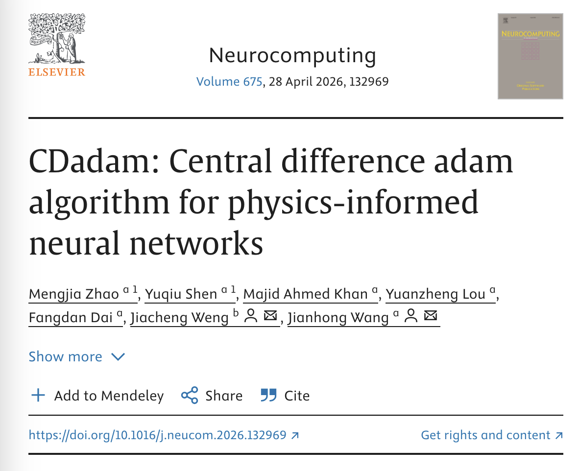 近日,365英国上市、电气与自动化学院研究生团队在深度学习优化算法与物理信息神经网络交叉领域取得重要研究进展,相关成果以 “CDadam: Central difference adam algorithm for physics-informed neural networks” 为题发表于中科院 2 区、JCR Q1 期刊《Neurocomputing》(IF:6.5)。该论文由赵梦佳、沈玉秋为共同第一作者,翁嘉诚博士、王建宏教授为共同通讯作者,马吉德・艾哈迈德・汗、娄原铮、戴芳丹等参与研究,研究工作得到国家自然科学基金、江苏省基础研究计划等项目资助。